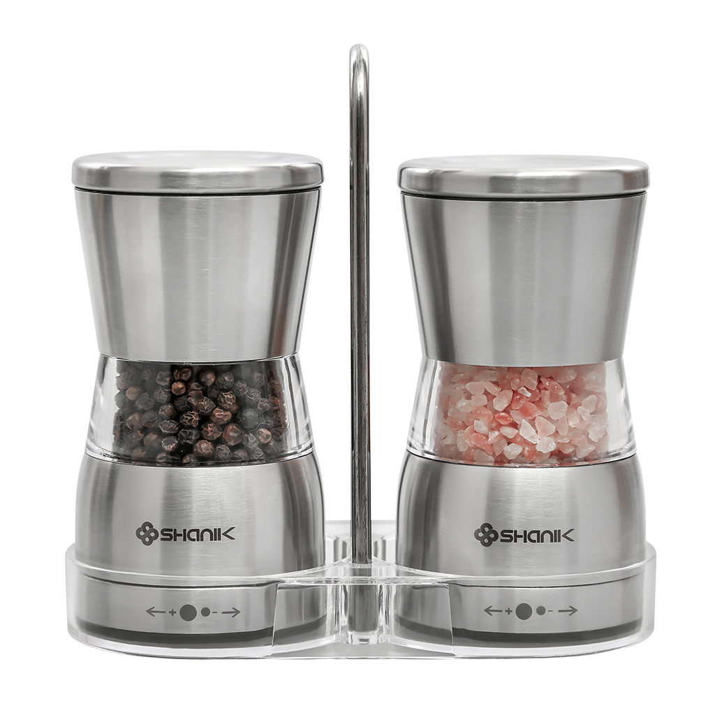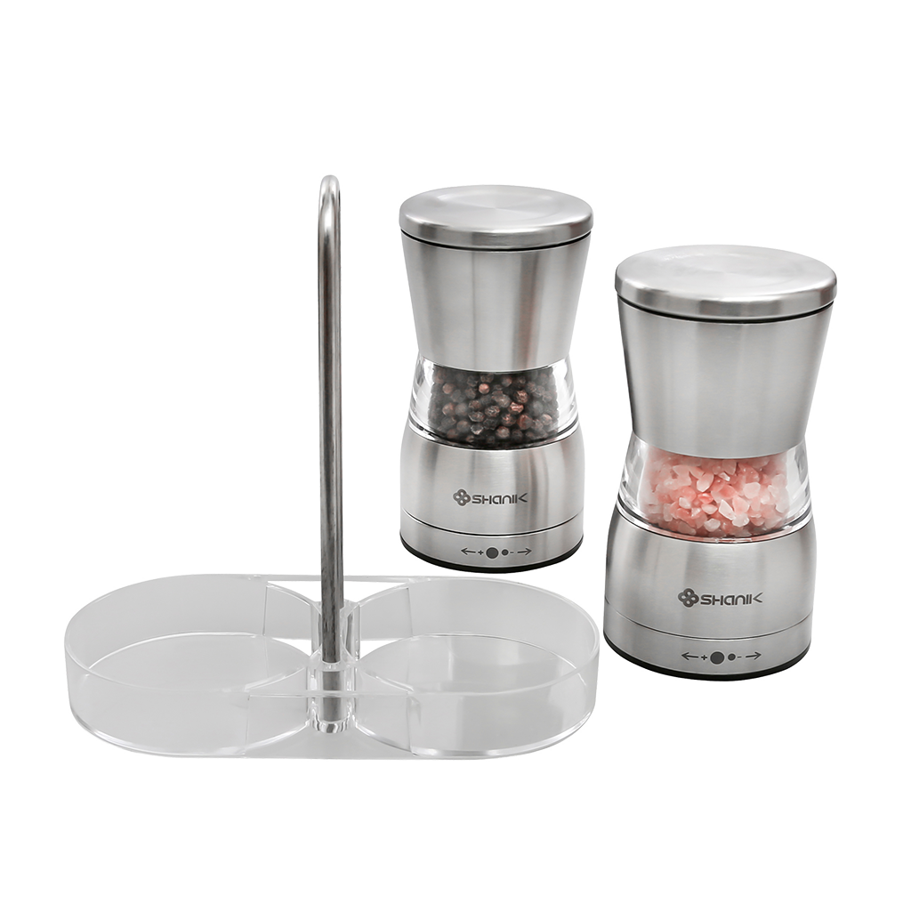 The set includes a light matching stand in order to place both grinders in and conveniently carry it from kitchen-to-table use.